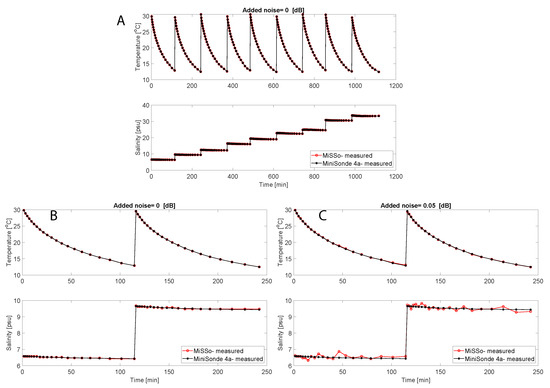 An example of a time series of MiSSo-measured T and S values is presented in Figure 3A–C. MiSSo data are plotted with concurrent CT sensor (MiniSonde 4a)-measured T and S. The effect of external noise, such as associated with biofouling, can be observed in Figure 3B,C where the addition of dB noise to the MiSSo reading increased uncertainty in the MiSSo retrieved salinity readings.