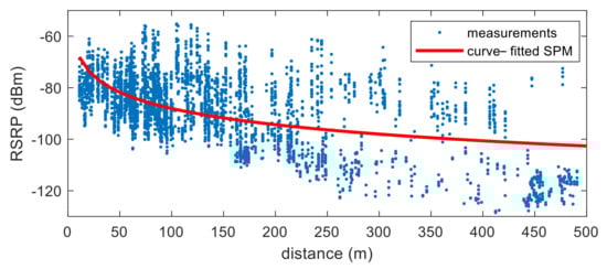 Considering this situation, the following problem exists: the location information of the base station is required for Signal Propagation Modelling (SPMing) but is not provided by the mobile carrier. Here, SPMing means regressing the coefficients of a SPM. Even if the RSRP measurements can be converted into distance information using the SPM provided in the literature, it is impossible to accurately estimate the location of the base station based on the existing trilateration method because of the large variance of the RSRP measurements []. This is the third motivation of this study.