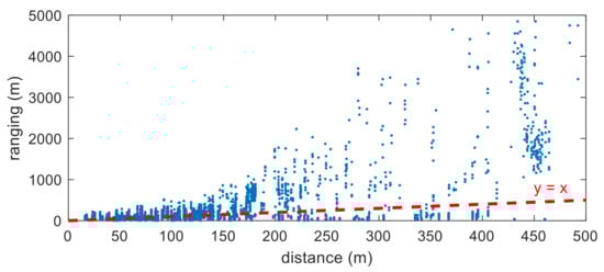 This is the basic formula for RSRP-based ranging. Figure 2 shows the ranging information converted from the RSRP measurements shown in Figure 1. In this figure, the horizontal axis is the distance between the base station and the location where the RSRP measurement is obtained, and the vertical axis is the value obtained by converted RSRP information into distance. What is expected is that ranging information is plotted around the graph of y = x. However, it can be seen from this figure that the ranging errors are very large, and the variance of the errors tends to increase gradually with distance.