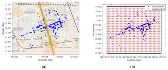 Step−A Searching Area Setting: Figure 4a shows the location information of signals acquired from the KT base station of Physical Cell Identity (PCI)−144 in Seocho−dong, Seoul, Korea. The locations at which the measurements were obtained are satellite-based augmentation system-based differential GPS information. Based on these measurements, a searching area is set for the positioning of the base station. In this figure, the blue dots are the locations of the RSRP obtained through a vehicle test, and it can be seen that measurements were obtained only in limited areas such as roads. The red dashed square shows the searching area.