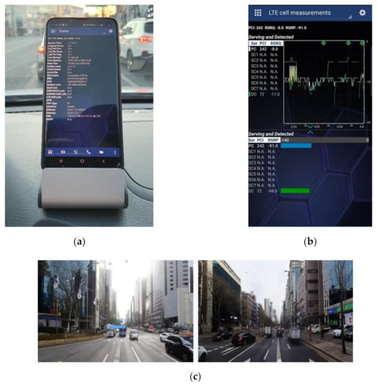 Experiments were conducted to verify the performance of the proposed SMaP. As shown in Figure 4, the test site is the center of Seoul, Korea, and the target mobile carrier is KT. As shown in Figure 5a, a smartphone S10 equipped with Nemo Handy, an LTE signal acquisition app from Keysight Technologies, was mounted in one vehicle and data was collected while driving for about 3 h on the road in the service area. This data includes downlink information of the LTE system and DGPS-based location information from which the information is obtained. An example of the signal acquired from Nemo Handy is shown in Figure 5b. This figure shows the number of the serving PCI and RSRP information of the received signals, and the information was saved as a file with the extension nmf. Figure 5c shows the urban environment seen from the vehicle during the signal acquisition experiment. From this figure, it can be seen that the signal propagation environment is not good because the tall buildings are attached to each other in the urban area, but signal propagation is easy in the road direction.