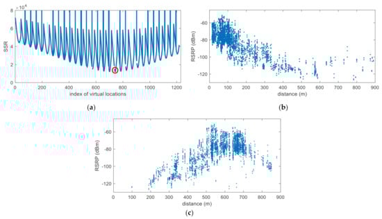 Figure 6a shows the SSR according to the VL. From this figure, it can be seen that SSR is calculated as a different value for each VL and there is one VL with the minimum SSR value. Figure 6b shows the reconstructed distance–RSRP information based on this VL. Here, the distance was calculated through (10). From this figure, it can be confirmed that the RSRP measurements according to distance are distributed in the form of a log function. Figure 6c shows the distance–RSRP information reconstructed by assuming an arbitrary VL, other than the VL with the minimum SSR value, as the base station. From these figures, if there is an error in the location information of the base station, it can be inferred that a large error will occur in SPMing due to the incorrect distance–RSRP measurement information formed based on this error. Because of this, the calculated SSR has a large value. Therefore, it can be confirmed that it is appropriate to determine the VL with the minimum SSR value obtained through Figure 6a as the location of the base station.