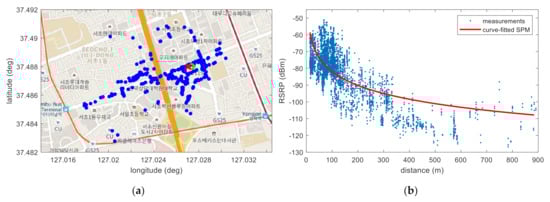 Figure 7 shows the results of performing SMaP and the comparison technique. In Figure 7a, the green circle is the actual location of the base station and the red x is the estimated location. The solid line in Figure 7b is the estimates of RSRP according to distance based on the SPM estimated using the measurements. Measurements obtained at a distance of more than 500 m from the base station are mostly signals propagated through roads. The power of these signals is greater than the signals propagating toward the building, not the road. Sometimes, signals from a repeater are received in this area, as can be seen in Figure 7d. The signal provided by the repeater is the same as that provided by the base station, and the PCI information included in the signal is the same as the neighboring base station PCI. Therefore, this signal is mistaken as a signal transmitted from a base station rather than a repeater, and the RSRP information of the signal received at a long distance from the base station has a large value, which adversely affects SPMing. Therefore, only signals acquired within 500 m are used for SPMing.