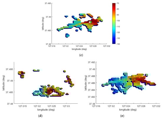 Additionally, Figure 7d,e supports this explanation. This figure shows the fingerprint DB constructed based on the measurements of two different base stations. In the case of PCI–186, it seems that there are several base stations with the same PCI based on the signal strength information alone. This is because there are repeaters in certain buildings. As a result, it is possible to obtain a measurement with a large RSRP value even at a location far from the actual base station. In the case of PCI–176, it can be seen that the base station is near the place where the RSRP value is large. Since the base station is installed on the building, there are many multipath signals in the vicinity. As a result, the largest RSRP measurement is taken near the base station, not the location of the base station. For these reasons, determining the location with the largest RSRP measurement as the location of the base station can lead to large errors.