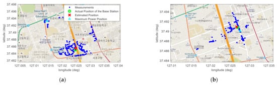 Figure 8a is the case where there are several repeaters, as shown in Figure 7d, and Figure 8c is the case where the measurements are spread widely around the base station, as shown in Figure 8b. In the rest, since the base station is installed near the road, the measurements are long distributed along the road and are distributed within a measurable distance toward the side of the road. In all cases, it can be confirmed that the locations of the base stations were accurately estimated through the SMaP proposed in this paper.