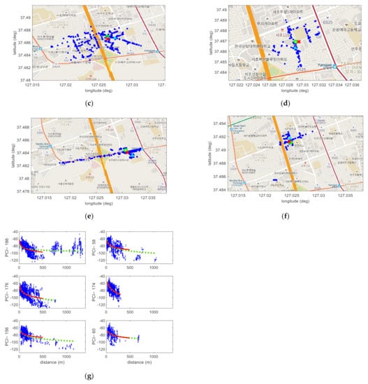 Experimental analysis is performed in the following order. First, Figure 6 shows that the minimum SSR value according to the VL has adequate regularity to prove the hypothesis that the VL with the minimum SSR value presented in this paper is close to the true location of the base station. In this figure, it is also shown that only the result of SPMing performed on the VL with the minimum SSR value is regressed in the form of (2). By showing in Figure 7 that the estimated location of the base station is near the true location as a result of the SMaP performed based on this data, it is confirmed that the hypothesis presented in this paper is highly likely to be correct. Another hypothesis other than this one can be considered. That is, the position having the highest power among the acquired RSRP information may be estimated as the position of the base station. However, if there is a repeater, Figure 7d shows that this method cannot accurately estimate the location of the base station. By showing in Figure 8 the results of SMaP performed based on 6 PCI data different from the PCI shown in Figure 7, it can be sure that the hypothesis presented in this paper is correct. As a result of SMaP, it can be seen in Figure 8g that not only the location of the base station but also the coefficients of the SPM can be accurately estimated. A detailed description of each figure is as follows.