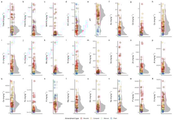 Chemical distribution of plants’ essential nutrients (N, P, K and plant-available form of nitrogen), and total elements derived through chemical analysis from bio-solid (red-color circles), composts (orange-color circles), manure (green-color circles) and plants residues (blue-color circles). y-axis shows the concentration of each element with all units in mg kg−1 except N which is in mg g−1 and the number of each element is shown on the x-axis. (a–x) Different properties of the 85 bio-based fertilizer samples.