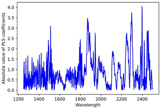 A simple method proposed by Frenich et al. [] based on the PLS regression coefficients (B) is used in this paper for the selection of characteristic wavelengths. The method proposes that the value of B can be used as a measure of importance for an individual wavelength in the prediction of the response variable. This is similar to the interpretation of parameters in linear regression. A high absolute value of B indicates that the corresponding wavelength is more important and has a high correlation with the response variable and vice versa [].
