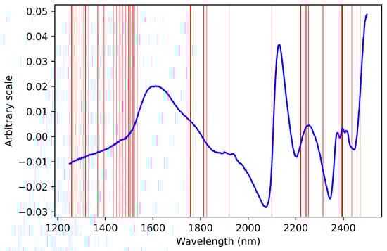 In the third step, wavelengths that had a low B value and low correlation with the response variable are discarded using Algorithm 1. The algorithm iterate and discard one wavelength at a time (the one with the lowest absolute value of the associated regression coefficient) and rebuild the calibration model and evaluate the mean square error (MSE) of the cross-validation set. At some point, removing wavelengths will increase the MSE, and that is the stopping criterion for the optimization algorithm. The remaining wavelengths were selected and it was expected that they will improve the prediction performance of the model. The wavelength selected for the nitrogen content in NIR spectra is shown in Figure 5.