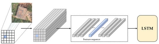 As a deep regression neural network, LSTM can handle long-term relationships of memory sequence information [22]. Many remote sensing image classification studies use LSTM to extract spatial and spectral features from images [23,24,25]. In this study, LSTM was used to explore the contextual dependencies between different regional feature sequences. The generation of feature sequences is the key to learning contextual feature dependencies. As shown in Figure 3, was transformed into a feature sequence , where . Each C-dimensional feature vector was fed into the LSTM sequentially as a feature sequence.