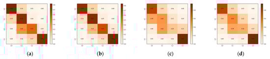Confusion matrix in Group 3: (a) baseline in the Ludian dataset; (b) EBDC-Net in the Ludian dataset; (c) baseline in the Yushu dataset; (d) EBDC-Net in the Yushu dataset.