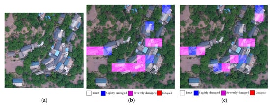 Example of assessment results of building damage in the Yangbi dataset: (a) original image; (b) EBDC-Net assessment results; (c) visual interpretation results.