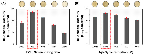 Changes in color intensity of the H2S sensing paper after exposure to Na2S (50 μM) according to (A) the mixing ratio of PVP and Nafion; (B) the concentration of AgNO3 concentration in the coating solution.