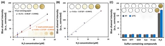 To evaluate the feasibility of the H2S-sensing paper, we compared the analytical performance of our paper assay with that of the lead acetate paper as a reference. Lead acetate test paper has been utilized to detect H2S gas produced by microorganisms and for evaluating the quality of water and food [15,28]. Lead acetate forms a brown lead sulfide after reaction with H2S gas, resulting in a color change to brown. As shown in Figure 3A, the change in blue channel intensity of lead acetate paper also showed a linear relationship with H2S concentration ranging from 2.05 to 16.4 μM (R2 = 0.9959). However, its sensitivity (6.05 blue color intensity/μM H2S) was lower than that of our H2S-sensing paper (8.27 blue channel intensity/μM Na2S) in the same concentration range of H2S. The LOD and LOQ of the lead acetate paper were found to be 1.31 and 4.25 μM H2S (n = 4), respectively, which were 1.4 times higher than those of our H2S-sensing paper.