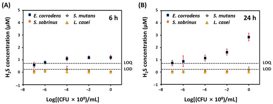 Quantitative analysis of H2S production from four kinds of oral bacteria such as E. corrodens, S. sobrinus, S. mutans, and L. casei according to the number of bacteria (1 × 101, 1 × 102, 1 × 104, 1 × 106, and 1 × 108 CFU/mL) (A) for 6 h; (B) 24 h incubation at 37 °C.