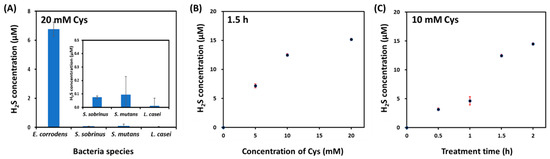(A) Quantitative analysis of H2S production from four kinds of oral bacteria such as E. corrodens, S. sobrinus, S. mutans, and L. casei (1 × 108 CFU/mL) after treatment with 20 mM Cys for 1 h. Effects of (B) Cys concentration (0, 5, 10, and 10 mM), and (C) treatment time (0, 0.5, 1, 1.5, and 2 h) on H2S production from E. corrodens (1 × 108 CFU/mL) at 37 °C.