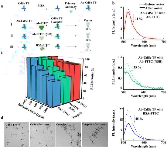 In the next step, we measured the content of captured proteins on CdSe TPs under vortex flow, as shown in Figure 2. CdSe TPs were functionalized with primary antibody and blocked by BSA preventing non-specific binding. PL spectra of CdSe TPs upon adding anti-goat IgG antibody and anti-mouse IgG antibody are shown in Figure 2b. PL intensity from CdSe TPs upon binding with antibody indicates that more anti-goat IgG antibodies are captured on CdSe TPs via specific binding compared to adsorbing anti-mouse IgG antibodies. Rotating complexes to generate flow motion, and increased shear force can promote convection, which ensures the enhanced protein capture at 1000 rpm. PL intensities of both complexes with anti-goat IgG antibody and anti-mouse IgG antibody increase by approximately 1.25-fold. From these results, we deduce that protein capture can be increased by rotating [] CdSe TPs in a vortex flow.