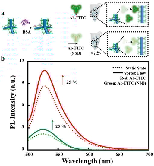 Protein capture before and after rotation. (a), Schematic of the CdSe TP functionalized with the primary antibody and BSA as a blocking agent. The PL intensities were compared to evaluate complexes before and after vortex flow. (b), PL spectra of the complexes with anti-goat IgG antibody and anti-mouse IgG antibody before and after vortex flow. Rotation time, 30 min. Rotation rate, 1000 rpm.