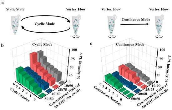 To further increase the sensitivity of complexes in the mixture solution, we designed experiments with continuous mode vortex flow and cyclic mode vortex flow. Continuous mode vortex flow rotated complexes for 1 h, whereas cyclic mode vortex flow rotated complexes for 30 min and remained static for 30 min in one cycle (Figure 4b). PL intensities of samples with different concentration ratios of 10%: 90%, 25%: 75%, 40%: 60% and 50%: 50% increase by 22.8%, 27.3%, 14.6% and 18.7% after 6 h of continuous mode, respectively (Figure 4c), indicating that more anti-goat IgG antibodies are captured on complexes under continuous mode vortex flow. In particular, PL intensities of samples with four different concentration ratios were increased even more by 64.7%, 68.3%, 30.4% and 41.1%, respectively, after six cycles of cycle mode vortex flow than after 6 h of continuous mode vortex flow. Thus, we conclude that the cyclic mode vortex flow ensures the non-specific protein removal and target protein capture more efficiently.