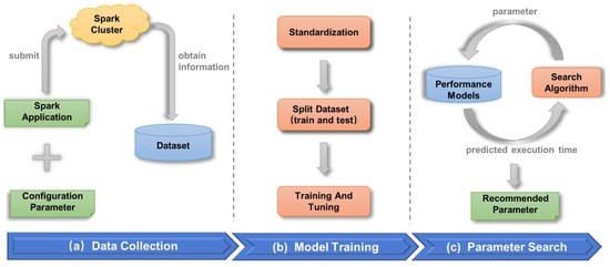 In this part, we introduce the Spark application configuration parameter optimizer in detail, which mainly consists of three phases: the collection and preprocessing of historical Spark application data; the training of a Spark application performance prediction model; and the search for better configuration parameters, corresponding to Figure 1a–c.
