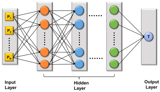 We employed a deep neural network to build a Spark performance prediction model. The structure is shown in Figure 2. A deep neural network is mainly divided into three types of layers: the input layer, the hidden layer, and the output layer. These layers are fully connected, which indicates that any neuron in the n-th layer is connected with any neuron in the n+1-th layer. The connection relationship is expressed in Formula (6).