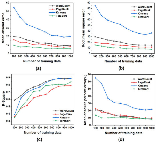 Relationship between the performance prediction model and the number of training data: As with most machine-learning tasks, using more training data leads to better predictive models. However, in practice, since each training datum is collected by the Spark application execution in a real cluster environment, collecting too many training data increases the time cost. Therefore, we need to find a balance between various model evaluation indicators and the number of training data, that is, reduce the number of training data as much as possible under certain conditions. Figure 3 shows the changes in the evaluation indicators of different Spark application performance prediction models from 100 to 1000 training data. Figure 3a shows that, with the continuous increase in the number of training data, the MAE value of the prediction model of each Spark application gradually decreased, of which Kmeans varied most significantly. When the number of training samples reached 700, the MAE value was no longer significantly decreased. Figure 3b,d shows that the changing trends of RMSE and MAPE were similar to those in Figure 3a. Figure 3c shows that, with the continuous increase in the number of training data, the value of also rapidly increased, that is, the fitting degree of our model was improved. After the number of training data had reached 800, the value of tended to be stable. The above experimental analysis shows that it is better to build a performance prediction model for a Spark application when the number of training data is greater than 800.