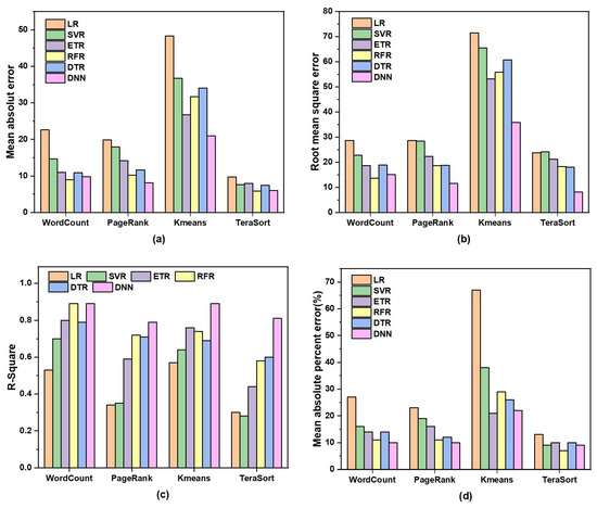 Performance comparison of deep neural-network models with other regression models on different Spark applications: (a) Mean absolute error. (b) Root mean square error. (c) R-squared. (d) Mean absolute percentage error.
