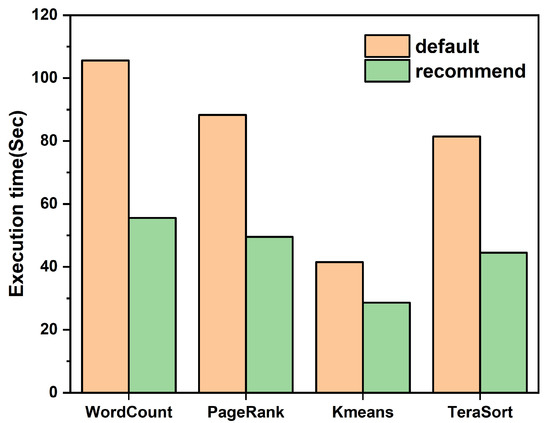 Execution time comparison between recommended configuration parameters and default configuration parameters on different Spark applications.