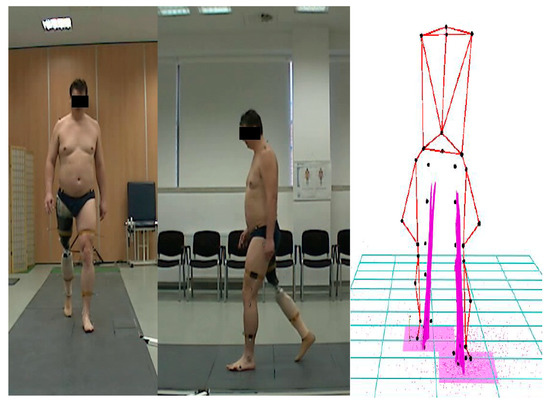 This study was conducted in a certified Laboratory of Biomechanical Analysis (PN-EN ISO 9001:2001) using the BTS Smart-E system (BTS Bioengineering, Milan, Italy). The cameras used in this system were: six infrared digital cameras (1.1 μm infrared light, 120 fps in 768 × 576 px resolution); two Network Cam AXIS 210A cameras (AXIS Communications, Tokyo, Japan) operating within visible range at 20 Hz; two piezoelectric force plates type 9286A (at 1 kHz; Kistler Instrumente AG, Winterthur, Switzerland) designed specifically for use in gait analyses with a measurement threshold of more than 250 mN and a range of 0–5 kN for the vertical component. Twenty-two photoreflective film markers were placed on the subject’s body following the procedure for the modified Hayes–Davis model. (Figure 1).