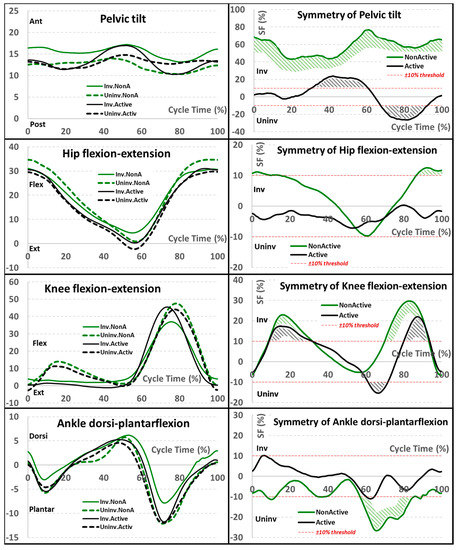 Sagittal plane kinematics for the pelvis, hip, knee and ankle joints (in degrees) for both involved/uninvolved limb and active/non-active groups (on the left); corresponding symmetry function (SF) for the active/non-active groups (on the right). The area exceeding the ±10% threshold was highlighted to discriminate between symmetrical and asymmetrical patterns. All angles are in degrees and the SF in percentage.