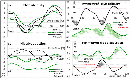 Frontal plane kinematics for pelvis and hip joints (in degrees) for involved/uninvolved limb and active/non-active groups (on the left); corresponding symmetry function (SF) for the active/non-active groups (on the right). The area exceeding the ±10% threshold was highlighted to discriminate between symmetrical and asymmetrical patterns. All angles are in degrees and the SF in percentage.