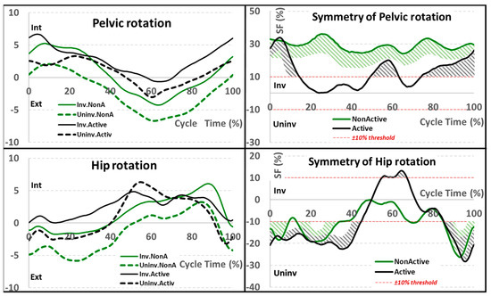 Transverse plane kinematics for pelvis and hip joints (in degrees) for both involved/uninvolved limb and active/non-active groups (on the left); corresponding symmetry function (SF in percent) for the active/non-active groups (on the right). The area exceeding the ±10% threshold was highlighted to discriminate between symmetrical and asymmetrical patterns. All angles are in degrees and the SF in percentage.