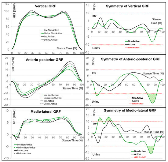 Ground reaction force components (in % of body weight) for both involved/uninvolved limbs and active/non-active groups (on the left); corresponding symmetry function (SF) for the active/non-active groups (on the right). The ±10% threshold was postulated to discriminate between symmetrical and asymmetrical patterns. All angles are in degrees and the SF in percentage.