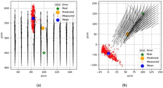 Figure 5a–c show the data of three sets of measurement points with coordinates (100,450), (100,150), (900,450), respectively, which were selected from different areas in the experimental scenario. The red “+” indicates the 500 sets of measurement coordinates, the blue dot indicates the mean value of these 500 sets of coordinates, the black arrow is the vector positioning error around the measurement point calculated according to the error model, and the yellow dot indicates the predicted measurement coordinates based on the surrounding calculation error. The distance between the mean value of the measured coordinates and the true and predicted coordinates decreased from 131 to 43 cm, as shown in Figure 5a, from 223 to 111 cm, as shown in Figure 5b, and as shown in Figure 5c, the values were essentially the same because of the small positioning error. It can be seen from the figure that the predicted coordinates were closer to the measured coordinates in different regions, which indicates that the vector positioning error model proposed in Section 3.2 could effectively predict the positioning error distribution in space.