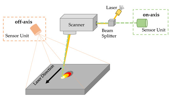 Numerous in situ monitoring approaches for specific process parameters and characteristics have been investigated, with the aim of deriving indicators or key amounts for the subsequent evaluation of process and component quality. Among other things, laser power [4], powder coating and powder bed surface [5], powder bed compaction [6], smoke plumes and spatter behavior [7], particle emissions [8], part distortion [9] and vibration during powder coating [10] were already considered. However, the main focus of research efforts in the field of in situ process monitoring is in the investigation of the spatial and temporal temperature distribution in and around the melt pool, i.e., the laser–material interaction zone [11,12]. The systems used for this purpose are mainly designed for measuring thermal radiation, and are based on non-contact measurement devices such as diodes, pyrometers and cameras sensitive at different wavelength ranges [13,14,15]. Based on the arrangement of the optical path, these systems can be divided into off-axis and on-axis systems (cf. Figure 2) [16].