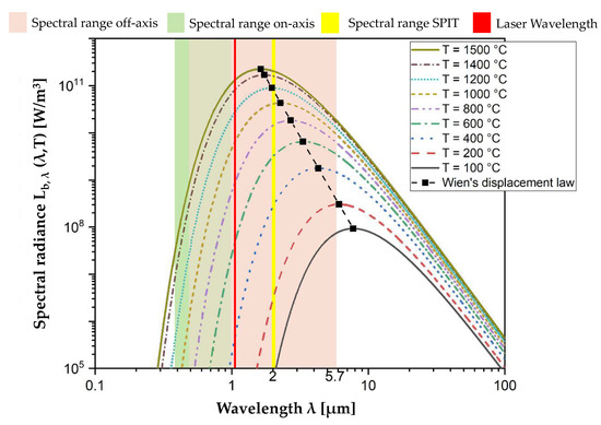 Visual representation of the spectral radiance distribution of a black body (Planck spectrum) and Wien’s displacement law for temperatures between 100 °C and 1500 °C [20]. The common spectral range of on-axis (light green area) and off-axis (light red area) systems, as well as the spectral range of the SPIT system (yellow bar) and the laser wavelength (red bar) are highlighted. The melting range of the material used in this investigation (AlMg3) is between 595 °C and 645 °C [30].