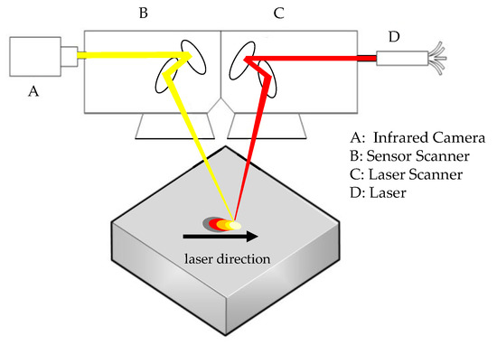 Schematic setup of Synchronized Path Infrared Thermography (SPIT). The measuring field of the camera (A) is moved by the sensor galvanometer scanner (B) synchronously with the working galvanometer scanner (C) of the laser (D).