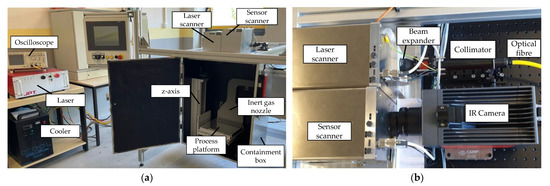 For downstream data analysis, the collected data were also stored as comma-separated value files that were analyzed and visualized with the help of MATLAB R2021a. Assuming that the brightest pixel always represents the laser–material interaction zone, the detection of this pixel can be used to draw conclusions about the positioning accuracy of the sensor system. Therefore, statistics about the position of the brightest pixel were carried out. Pictures taken during the time when the laser was deactivated, e.g., during jumps between separated characters, were not considered. The entire setup is shown in Figure 5.