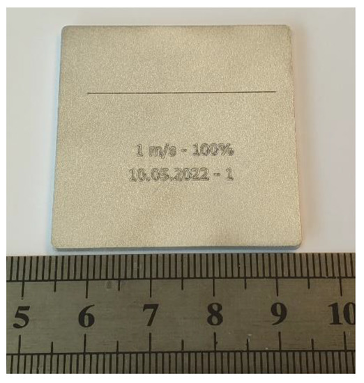 To further validate the accuracy of the setup and the ability to detect the thermal effects of laser–material interaction, a series of sample exposures were performed at different laser speeds and laser powers on plain aluminum plates. The parameter range is shown in Table 1. For every combination of laser speed and laser power, the path consisted of a straight line along the X-axis with a length of 32 mm. After completion of the line, the current test parameters and date were engraved (cf. Figure 6). The data produced while engraving the current parameter set and date were also part of the evaluation in order to represent complex laser paths in the x–y plane. Therefore, a font size of approximately 2.5 mm was chosen. Sandblasted plates made of AlMg3 with the dimensions of 40 × 40 mm2 and a thickness of 2 mm were used as the base material.