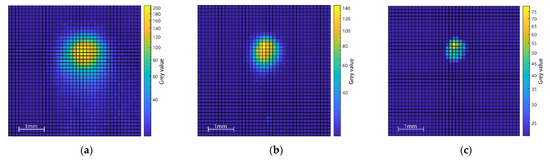 Based on static pointwise measurements at different locations in and near the zero point of the superimposed coordinate systems, the laser spot could be assigned to a defined single pixel at the sensor unit. Further, the evaluation of the distinctive thermal images of these measurements showed the single brightest pixel at the place where the beam interacts with the surface. Surrounding pixels also showed significantly increased gray values, representing the zone of thermal influence (cf. Figure 7). During initial dynamic measurements near the zero point, the brightest pixel of the measurements corresponded with the previously determined laser spot location on the sensor. Therefore, the brightest pixel in each image was used as the reference point for the precision evaluation of the setup.
