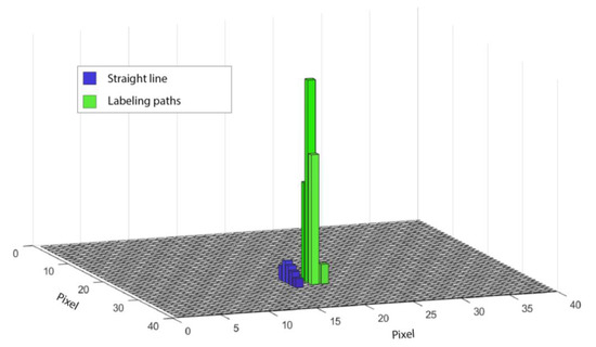 While moving along the x-axis to carry out the straight line, no deviation in the brightest pixel along the y-axis was observed. Meanwhile, the roaming within the field of view along the x-axis was consistent in all sets with a span of 5 pixels. After finishing the straight line, there was a jump along the y-axis to the beginning of the first digit. This jump can also be correlated to the omission of a whole senor line when analyzing the position of the brightest pixels. This skipped line is recognizable across all settings and, again, indicates the geometric relation between position and deviation (cf. Figure 8).