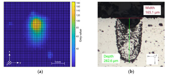 In addition to the brightest pixel, a heat-affected zone can be observed in the thermography images (cf. Figure 9a), the dimension of which depended on the energy input into the surface, varying from approximately 2.2 mm at 460 W laser power and 0.05 m/s scan speed to 0.8 mm at 105 W laser power and 1 m/s scan speed. Subsequently carried-out metallurgical examinations (cf. Figure 9b), in which the dimension of the melt pools were determined, have shown that the areas of increased temperature visible in the thermography exceeded the width of the melt pool.