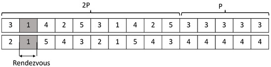 In [6], a generated orthogonal sequence (GOS) that requires a symmetrical model was proposed; that is, the channels in the hopping sequence are assumed to be the same. In addition, there is a possibility of unproductive utilization of channels caused by an imbalance of traffic on different channels. In modular clock (MC) and modified MC (MMC) [3], a hopping sequence is generated by a modulo operation based on some prime number and rate, which are randomly selected by each user. However, MC cannot guarantee rendezvous in the asymmetric case; therefore, an MMC is proposed. In MMC, two users should select different prime numbers to guarantee rendezvous, although they fail to assure the same prime number. In [10], jump-stay (JS) is proposed to support both synchronous and asynchronous cases. JS takes less time to rendezvous compared to the other algorithms and guarantees rendezvous within a finite time. This hopping sequence consists of two jump-pattern to hop over available channels and one stay pattern to keep staying on the same channel. We present a general JS sequence in Figure 1 as this is the basic consideration for many other approaches. Later, enhanced jump-stay (EJS) [24] modifies the JS to one jump-pattern and one stay-pattern. EJS advances the state of the art by referring to the overall smallest upper bound without any additional information.