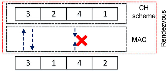 We considered an asynchronous network model, that is, there is no global time synchronization among SUs. However, the duration of a slot should be long enough to complete the rendezvous process. For analytical simplicity, we assumed that the clock difference between two SUs is a random integer [52], the number of mini-slots [52]. In this study, we considered reliable active scanning (RAS), which is simple and efficient for detecting loss of probe request and fast retransmit or hop on the next channel. However, successful transmission of the probe request is unpredictable owing to some collision probability and the lack of acknowledgment. In this active scanning, an SU broadcasts a probe request and expects to receive a probe response from any neighboring SU. Figure 2 depicts the basic structure of the rendezvous process considered in this study. Two users can hop on different channels; however, when both hop on the same channel, there should be a successful exchange of messages which is indicated by the arrows in Figure 2. In an worst-case scenario, users on the same channel could experience collision as shown on channel 4 in Figure 2 with the cross sign.