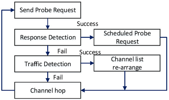 Channel availability is flexible during channel hopping, and SUs must detect if the channel is free from the incumbent or any other SUs. We integrated -based active scanning with the channel-hopping scheme. According to the active scanning method, a station actively broadcasts a probe request frame on the current channel and expects to receive a probe response from the access points (APs) [53]. Similarly, in the cognitive network structure for rendezvous, the response frame is from the SUs who have successfully received the probe request. On some channels, there are no SUs to receive the probe request, while others may have more than one SU. After sending the probe request, there are two steps: response detection and traffic detection, according to Figure 3. The response time is a small duration reserved exclusively for a probe response frame. If an SU does not detect any probe response during this period, the probe request is not delivered properly. Upon successful response detection, the rendezvous process will be complete, and the user will schedule for the next rendezvous attempt. The traffic detection occurs after the response time when the SU fails to detect any transmission. If the SU successfully detects any packet or collision during the traffic detection time, it determines that this is an active channel, and the probe request is lost. Based on this, the SNR values of the channels will be rearranged for the next .