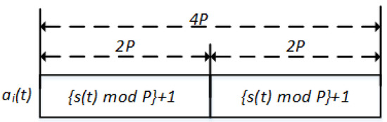 From the result of Theorem 1, there must be the same symbol in time slots. Because , if there is a time slot with the same symbol at and , then and also have the same symbol at the same time slot as the value increases by m.