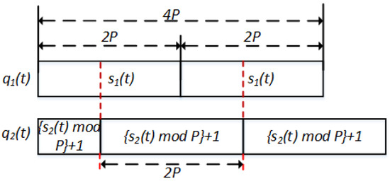 Let and be the initial times for users 1 and 2, respectively. Without loss of generality, it can be stated that . Subsequently, we can define and , which can be seen as the initial time for users 1 and 2, respectively. Figure 6 depicts the sequence and with a time difference .