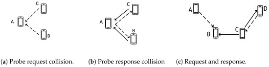 For the blind rendezvous process, we particularly selected the probe request and response messages. Most studies on rendezvous have considered RTS/CTS for user discovery, which is unrealistic. The RTS packets are unicast; therefore, a specific destination address must be provided in the RTS packet. In the legacy system, RTS/CTS are used for channel reservation when the destination AP address is known. In contrast, in a rendezvous process, the user has no information about the other users in the network. We consider rendezvous as an initialization process in which a user tries to connect with any other user in the network. Hence, there is no specific destination address that is known to the user.