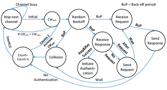 - Liu, Q.; Hu, G.; Wang, X.; Zhou, X. A cooperative CSMA/CA MAC for channel-hopping rendezvous based cognitive radio networks. In Proceedings of the 9th International Conference on Communications and Networking in China, Maoming, China, 14–16 August 2014; pp. 539–544. [Google Scholar]