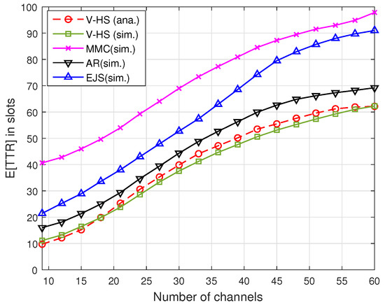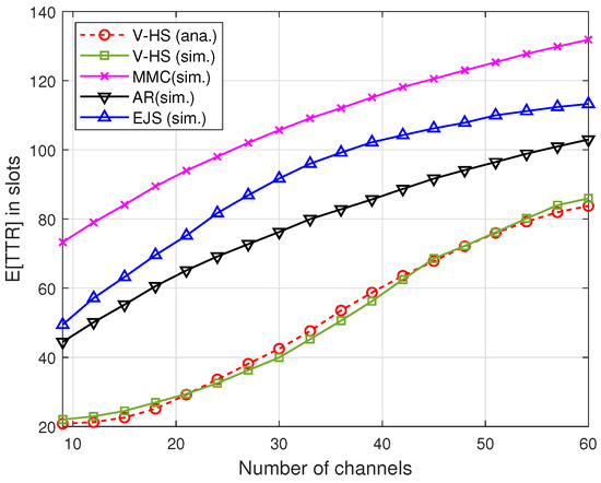 Figure 13 and Figure 14 illustrate the TTR of the present scheme without MAC, where V-HS is compared with MMC, EJS, and AR for symmetric and asymmetric models, respectively, as a function of the number of channels. As shown in Figure 14, G was considered to be 60%, that is, the users have 60% of channels common between them. These results indicate that V-HS achieves reduced TTR compared to the other schemes for both symmetric and asymmetric models. MMC chooses a random prime number for the rendezvous operation, and in our simulation users select the prime repeatedly until rendezvous is achieved. In the case of JS and AR, a user stays for a long time in the stay period, which is P in every , which increases the expected TTR, whereas V-HS takes advantage of odd and even slot structure, thus reducing the overall TTR as proved in our theoretical analysis. The simulation results also justify the theoretical E[TTR]. It can be observed in both figures that E[TTR] increases with the increase in the number of channels because the users have to hop on more channels.